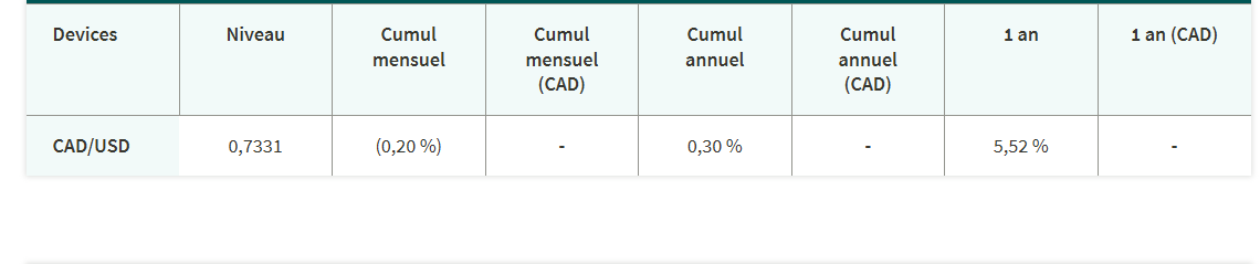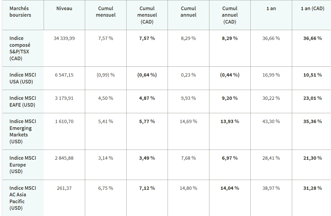 L’indice composé S&P/TSX a dégagé des gains considérables ce mois-ci, au point même d’atteindre des sommets inégalés. Les actions états-uniennes ont un peu baissé. Les rendements des obligations gouvernementales à 10 ans du Canada et des États-Unis ont reculé. Le prix du pétrole a monté, tout comme celui de l’or.